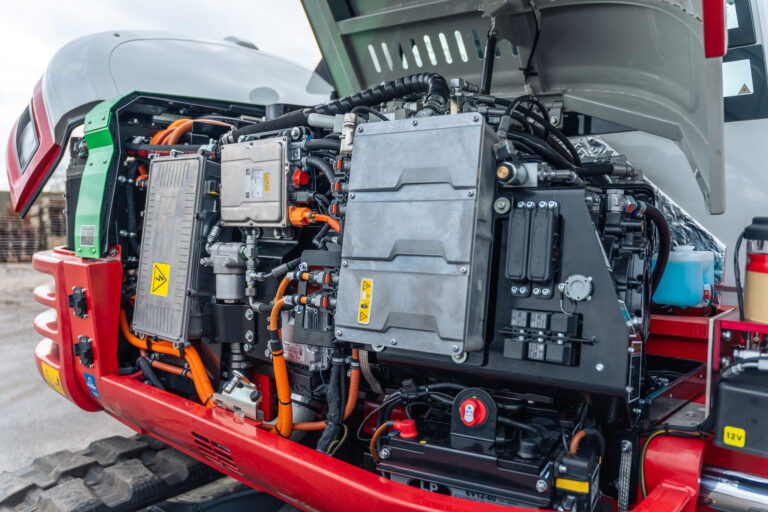 De machine beschikt over een 212 kWh Lithium ijzer Fosfaat (LFP) accu – de veiligste accutechniek op de markt. Met 77 kW continuvermogen en een piekbelasting tot 707 Nm bij 1200 rpm is er voldoende capaciteit voor een volledige werkdag onder normale omstandigheden. De 400V oplaadaansluiting (32Amp) maakt het laden aan boord gemakkelijk.